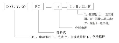 DFC電動(手動、電液動與氣動)三通分料閥分為Ⅰ、Ⅱ型,均帶導向板,Ⅰ型為側三通分料閥,Ⅱ型為正三通分料閥,四通分料閥分為Ⅲ、Ⅳ型,均帶導向板,Ⅲ型為二進二出,Ⅳ型為一進三出。