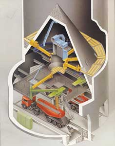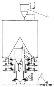 IBAU均化庫采用德國漢堡公司的連續(xù)均化技術。在外部帶一攪拌倉,庫底中心設一大圓錐,庫內(nèi)生料的重量通過錐傳遞給庫壁,庫底環(huán)形空間被分成向中心傾斜10°的6個充氣區(qū),每區(qū)裝多種規(guī)格充氣箱。充氣卸料時生料被送至一條徑向布置的充氣箱上,再經(jīng)過錐體下部的出料口由空氣斜槽送入庫底中央攪拌倉中。卸料時,生料在自上而下的流動過程中,切割水平料層而產(chǎn)生重力混合作用,進入攪拌倉后又因連續(xù)充氣攪拌而得到進一步均化。均化值可達6-8,電耗0.1-0.2kwh/t生料。